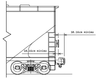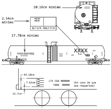 2.8.2. Las iniciales de la empresa ferroviaria o propietario del carro y el número del carro deben estar marcados (estencilados), de tamaño no menor a 17.78 cm (7 in) de alto en los costados y 10.16 cm (4 in) de alto en los extremos del carro. La fecha de construcción solo debe marcarse en los costados del carro con letras y números que no deben ser menores a 2.54 cm (1 in) de alto, tal como se muestra en la Fig. 16.