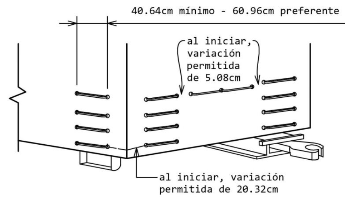 2.7.1.11.5.3. Instalación. Deben estar sujetos correctamente a la plataforma de extremo y sujetadas desde el carro a intervalos no mayores de 3.04 m (10 ft).