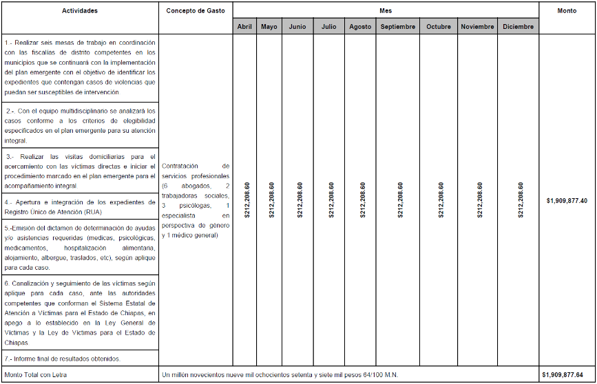 | Realizar la contratación de servicios profesionales (un abogado), que complementará el grupo interdisciplinario que atenderá a las víctimas directas e indirectas. | 144,155.88 | 0.00 | 144,155.88 |