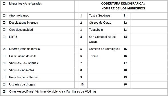 | 2 | Una vez analizados y determinados los casos, se procederá a la continuidad en la implementación del plan emergente elaborado en el año 2021, conforme a las estrategias y líneas de acción ahí establecidas, todo ello, a cargo del personal especializado contratado quienes brindarán el acompañamiento jurídico, psicológico y trabajo social a las mujeres, niñas y adolescentes víctimas directas e indirectas de violencias en los municipios de Tuxtla Gutiérrez, Chiapa de Corzo, Tapachula, San Cristóbal de las Casas, Comitán de Domínguez y Tonalá, que cuentan con alerta de violencias, a fin de brindar atención integral y aportar los elementos para una reparación integral y acceso a la justicia pronta y expedita. |