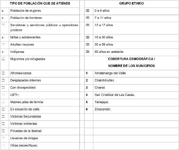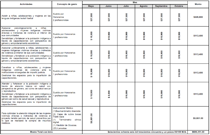 | 1 | Contratación de 6 profesionistas, que cumplan con los perfiles requeridos bajo la modalidad de prestación de servicios por honorarios asimilables a salarios, de los cuales serán: 2 especializadas en traducción de lengua materna tsotsil y tseltal, 1 especializada en derecho, 1 especializada en psicología, 1 especializada en trabajo social y 1 especializada en ciencias de la salud; para desarrollar asistencias (traducciones), asesorías jurídicas, asesorías psicológicas, capacitaciones, canalizaciones y asistencia médica básica. |