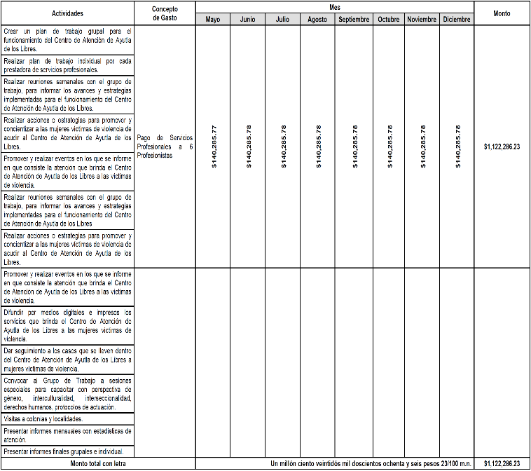 | · Crear dos módulos de Atención a Mujeres en situación de riesgo el municipio de Ayutla de los Libres, que contemple asistencia multidisciplinaria. | · Crear un plan de trabajo grupal para el funcionamiento del Centro de Atención de Ayutla de los Libres. | · Plan de trabajo grupal. | · Plan de trabajo grupal digital. |