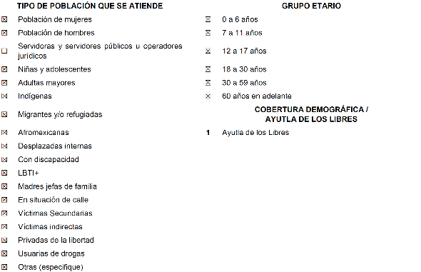 | Medida de seguridad 3. Crear módulos de atención inmediata a mujeres en situación de riesgo en los municipios que comprende la declaratoria de AVGM. Su funcionamiento deberá contemplar asistencia multidisciplinaria (abogadas, psicólogas, médicas, trabajadoras sociales y elementos de seguridad) y el respectivo protocolo de actuación de las y los servidores públicos encargados de brindar los servicios correspondientes. | Atención. Son las acciones destinadas a la atención de las mujeres y las niñas y las adolescentes, tendientes a disminuir las condiciones de riesgo en el que se encuentras, así como garantizas espacios libres de violencia contra las mujeres, las niñas y la protección de las víctimas. | Promover la cultura de prevención de la violencia contra las niñas, adolescentes y mujeres; así como dar atención integral en casos de violencia, y que estos sean dirigidos con perspectiva de género, interculturalidad, interseccionalidad y en estricto apego a los derechos humanos. Se establecerá una metodología de atención desde el primer contacto hasta finalizar la atención, haciendo referencias, en casos necesarios, con los programas del Gobierno de México para su incorporación laboral. Este Proyecto se desarrollará en el Municipio de Ayutla de los Libres, y se pretende que su alcance sea de manera regional. Para funcionamiento y operación de los módulos será en el marco de los derechos humanos, la transparencia y la rendición de cuentas. |