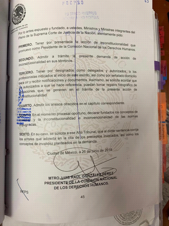 15. Esta causal de improcedencia es infundada, toda vez que se examinó el carácter de quien comparece a nombre de la CNDH en el apartado de legitimación. En efecto, como se advierte de las consideraciones previas, el escrito de demanda presentado por el presidente de la CNDH sí está firmado(22). Tal como muestra la siguiente imagen, localizada en la foja 45 del expediente de la acción, la demanda presentada por la CNDH fue firmada por su titular: