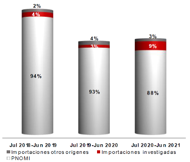 b. Las importaciones investigadas se incrementaron tanto en términos absolutos como relativos. Durante el periodo analizado su volumen se incrementó 91% y aumentaron su participación respecto al CNA y el consumo interno en 5 puntos porcentuales al pasar de 4% en el periodo julio de 2018-junio de 2019 a 9%, en el periodo investigado. En relación con la PNOMI representaron 4% y 11% en los mismos periodos, respectivamente.