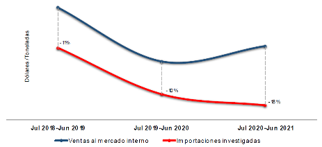 139. En este sentido, el comportamiento observado tanto de los ingresos por ventas al mercado interno de la rama de la producción nacional como de sus costos de operación, dio como resultado que las utilidades operativas en el mercado nacional disminuyeron 0.85 veces en el periodo julio de 2019-junio de 2020, pero aumentaran 2.9 veces en el periodo investigado, lo que se reflejó en una disminución de 0.41 veces en la utilidad operativa durante el periodo analizado. Asimismo, el margen operativo disminuyó 7 puntos porcentuales en el periodo julio de 2019-junio de 2020, pero aumentó 6 puntos porcentuales en el periodo investigado, de modo que, en forma acumulada, disminuyó 1 punto porcentual al pasar de un margen de 9.1% en el periodo julio de 2018-junio de 2019 a 8.1% en el periodo investigado.
