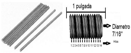 d. en combinación con el diámetro, presentan un número de "vueltas o crestas" específico que deben tener por cada pulgada (hilos por pulgada), el cual se reduce conforme el diámetro se incrementa, por ejemplo, conforme la norma ASME B1.1 2003 (R2008), las varillas de acero roscadas de diámetro de ¼, 1 y 1 ½ pulgadas tienen 20, 8 y 6 hilos por pulgada, respectivamente, y