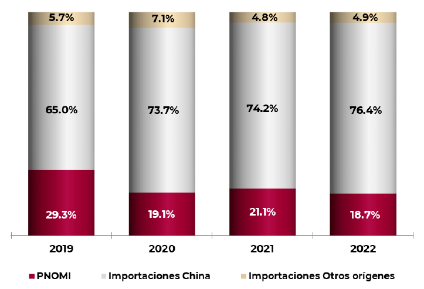 b. Las importaciones investigadas se incrementaron en términos absolutos y relativos. Durante el periodo analizado registraron un crecimiento de 67%: 15% en 2020, 12% en 2021 y 30% en 2022, lo que les permitió incrementar su participación en las importaciones totales, al pasar de una contribución de 92% en 2019 a 94% en el periodo investigado. En relación con el CNA, pasaron de 65% a 76.4%, lo que significó un aumento de 11.4 puntos porcentuales en el periodo analizado (2.2 puntos porcentuales en el periodo investigado), o bien, 10.6 puntos porcentuales en el consumo interno (4.8 puntos porcentuales en el periodo investigado).
