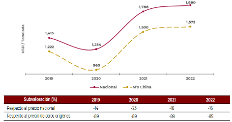 c. En 2019, 2020, 2021 y 2022 el precio promedio de las importaciones investigadas se ubicó por debajo del precio de venta al mercado interno de la rama de producción nacional, en porcentajes de 14%, 23%, 16% y 16%, respectivamente, y del precio promedio de las importaciones de otros orígenes, en porcentajes de 89% tanto en 2019 como en 2020 y 2021, y 85% en 2022.