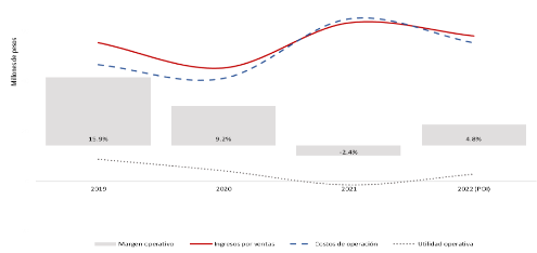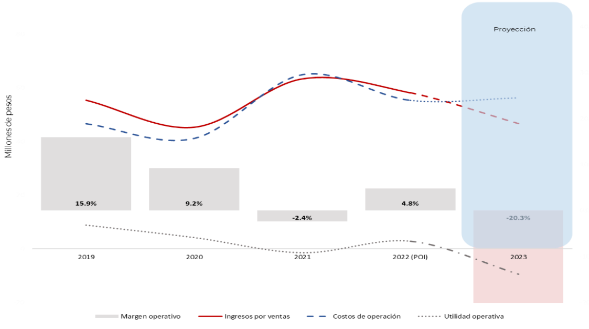 235. Asimismo, como resultado del comportamiento en los ingresos proyectados por ventas y de los costos operativos para 2023 (disminución en ingresos de 20% y aumento de costos de operación en 2%), los resultados operativos en el mercado nacional observarían un descenso de más de 4 veces al observado en 2022 (incluso volviéndose pérdida operativa en 2023), así como un deterioro de su margen operativo en 25.1 puntos porcentuales que finalizaría en 20.3% negativo.