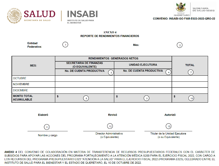 10. Registrar el importe total de los rendimientos financieros generados al cierre del ejercicio fiscal, tanto para la Secretaría de Finanzas (o su equivalente), como para los Servicios Estatales de Salud y/o Unidad Ejecutora.