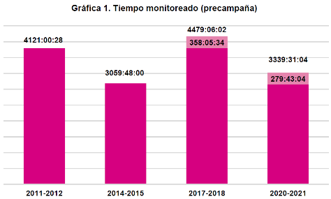 Al dividir el tiempo de monitoreo entre el número de días de precampaña se puede apreciar que en el último ejercicio realizado se analizaron más horas de grabación que en procesos electorales anteriores, sin importar el tipo de elección. Durante la precampaña del PEF 2011-2012 se monitorearon sesenta y ocho (68) horas y cuarenta y un (41) minutos. Durante la precampaña del PEF 2014-2015 este número fue de setenta y seis (76) horas, veintinueve (29) segundos y cuarenta y dos (42) segundos. En el PEF 2017-2018 el tiempo fue de setenta y cuatro (74) horas, treinta y nueve (39) minutos y seis (6) segundos. En el PEF 2020-2021, esta cifra aumentó hasta ochenta y tres (83) horas, veintinueve (29) minutos y diecisiete (17) segundos. Esto implica un aumento de entre nueve por ciento (9%) y veintidós por ciento (22%), en relación con los tres monitoreos anteriores.
