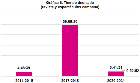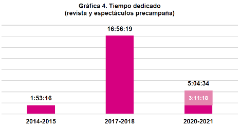 El efecto contrario ocurre en los programas de espectáculos y revista, donde se dedicó ciento sesenta y nueve por ciento (169%) más de tiempo a las precampañas del PEF 2020-2021 que a las del PEF 2014-2015, esto es un aumento de tres (3) horas, once (11) minutos y dieciocho (18) segundos, como se observa en la gráfica 4.