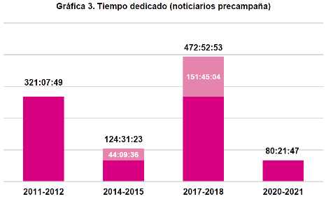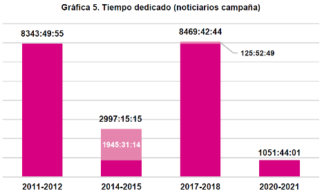 Al pasar de una elección presidencial (2011-2012 o 2017-2018) a una intermedia (2014-2015 o 2020-2021), el tiempo total monitoreado en campaña disminuye entre treinta por ciento (30%) y treinta y seis por ciento (36%). Es importante recordar que la duración de la campaña es treinta y tres por ciento (33%) más corta, esto es, treinta (30) días menos.