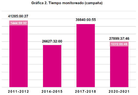 El tiempo monitoreado en campañas por día también fue mayor en el último ejercicio de monitoreo. En el PEF 2011-2012 se visualizaron cuatrocientas cincuenta y ocho (458) horas, cuarenta y tres (43) minutos y veinte (20) segundos. En el PEF 2014-2015, cuatrocientas cuarenta y tres (443) horas, cuarenta y siete (47) minutos y treinta y dos (32) segundos cada día en promedio; en el PEF 2017-2018, cuatrocientas cuarenta y dos (442) horas, cuarenta (40) minutos y un (1) segundo; y en el PEF 2020-2021, el tiempo diario promedio monitoreado en campaña aumentó a cuatrocientas sesenta y cuatro (464) horas, cincuenta y nueve (59) minutos y treinta y ocho (38) segundos. Por lo tanto, el monitoreo diario promedio de campañas del PEF 2020-2021 contempló entre uno por ciento (1%) y cinco por ciento (5%) más tiempo que los tres ejercicios anteriores.