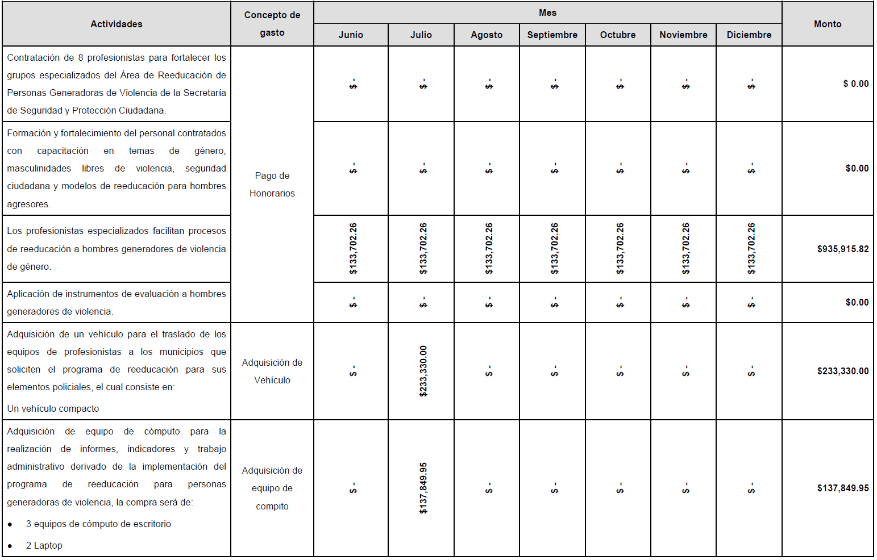 | Objetivo 5. | Se realizarán las gestiones correspondientes para la compra del vehículo en el que se trasladarán los equipos de profesionistas a los municipios de Tuxtla Gutiérrez, Berriozábal, Suchiapa y San Fernando, de la región centro de Chiapas, que soliciten el programa de reeducación para sus elementos policiales. Se realizará el proceso de licitación para la compra de equipo de cómputo para el desarrollo de un sistema informático que produzca datos estadísticos acerca de los usuarios, la realización de informes, indicadores y trabajo administrativo derivado de la implementación del programa de reeducación para personas generadoras de violencia, Así mismo, se llevara a cabo el proceso de licitación para la adquisición de bienes mobiliarios para fortalecer el Área de Reeducación debido a que es de reciente creación. |