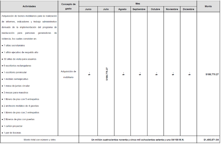 | | Adquisición de bienes mobiliarios para la realización de informes, indicadores y trabajo administrativo derivado de la implementación del programa de reeducación para personas generadoras de violencia, los cuales consisten en: - 7 sillas secretariales - 1 sillón ejecutivo de respaldo alto - 30 sillas de visita para usuarios - 6 escritorios rectangulares - 1 escritorio peninsular - 1 módulo semi-ejecutivo - 1 mesa de juntas circular - 3 mesas para maestros | 3.- Mobiliario y equipo de oficina comprado. | Factura de bienes mobiliarios Acta de entrega del Proveedor Formato de entrada y salida del bien de almacén Evidencia fotográfica Resguardo |