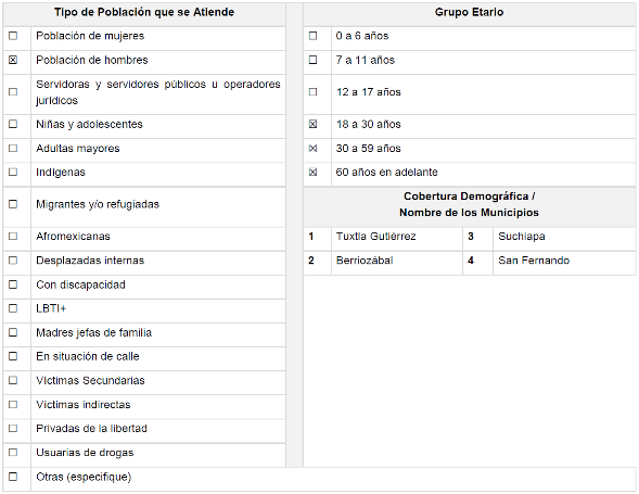 | Dependencias de la Administración Pública del Estado de Chiapas. | Beneficiarios del Programa de Reeducación a Hombres Generadores de Violencia |