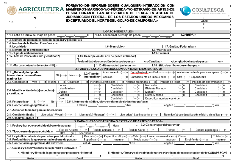 | 2.2. Tipo de interacción | Marcar la casilla con (X) en caso de una de las situaciones siguientes: Acercamiento: Cuando desde la embarcación existe contacto visual con el organismo con riesgo de colisión. Colisión: Cuando la embarcación hace contacto o golpea al mamífero marino. Enmallamiento en red: Cuando una parte del cuerpo del mamífero marino (cabeza, aleta, cola, etc.) o el organismo completo está enredado en la malla de la red. Acción con arte de pesca o captura: Cuando el arte de pesca encerró o capturó a un mamífero marino. Enredamiento en línea o cabo: Cuando una parte del cuerpo del mamífero marino (cabeza, aleta, cola, etc.) o el organismo completo está enredado en la línea principal del arte de pesca o en los cabos del aparejo de pesca. Otro: Marcar la casilla con (X) en caso de presentarse una interacción de otro tipo. Especificar: Especificar el tipo de interacción presentada con el mamífero marino. |