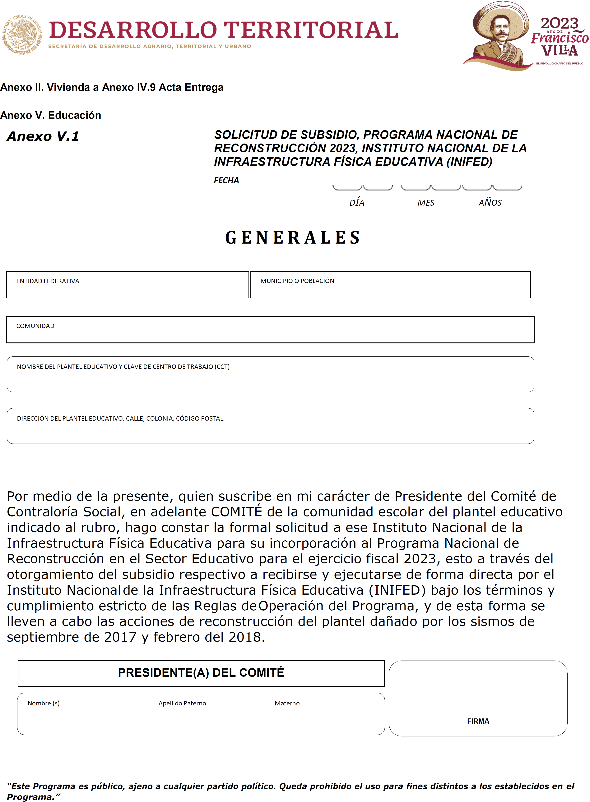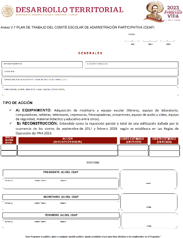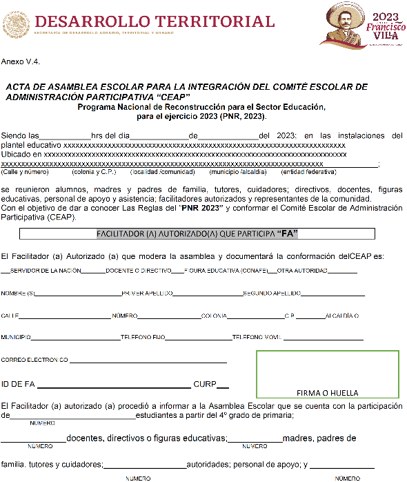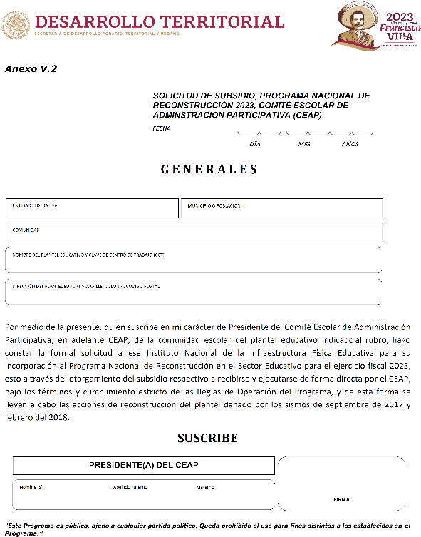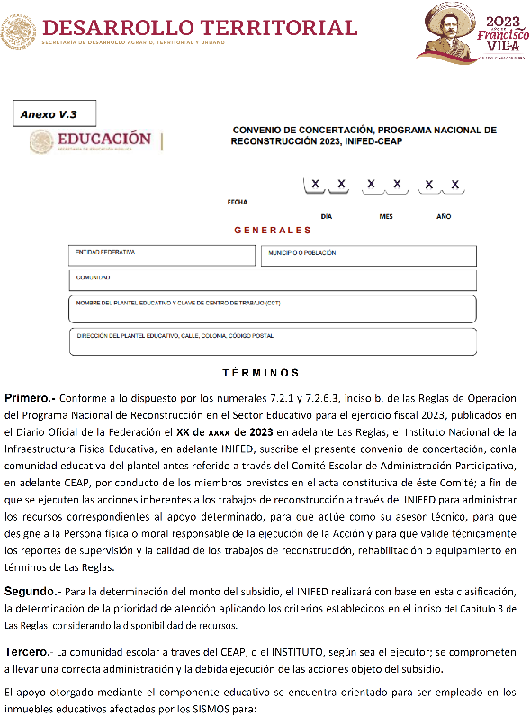Con fundamento en el numeral 7.2.6.1, inciso A) de las Reglas de Operación del Programa Nacional de Reconstrucción para el ejercicio fiscal 2021 publicadas en el Diario Oficial de la Federación el XX de XXXXXXX de 2023, se convoca a la Comunidad Educativa del Plantel Educativo {nombre del plantel educativo} con CCT (Número de Clave de Centro de Trabajo) ubicado en {dirección del plantel educativo} a asistir a la Asamblea Escolar con objeto de integrar el Comité Escolar de Administración Participativa de ese plantel.