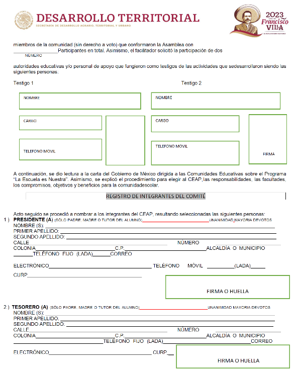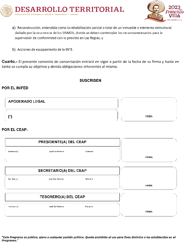 <<nombre del titular o suplente del Comité Escolar de Administración Participativa (CEAP'S) >> en su carácter de representante del Comité Escolar de Administración Participativa del plantel mencionado, el C. <<nombre la persona física o representante de la persona moral>> en su calidad de representante legal de la empresa <<nombre de la empresa>>, y el(la) C. <<nombre del director(a) del plantel educativo>> en calidad de testigo; con el fin de proceder a la entrega formal de los trabajos ejecutados por la (persona física o moral) al amparo del Programa Nacional de Reconstrucción, en el ejercicio 2023, para la realización de la acción, que se determinó por el CEAP y para lo cual le fue otorgado el subsidio, según su solicitud al INIFED en fecha «*»del año dos mil veintiuno, acción (acciones) que consistieron en: