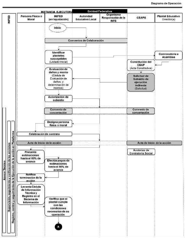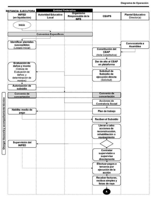 A. Subsidio y ejecución directa. El CEAP del plantel educativo que cumpla con los requisitos de elegibilidad, solicitará el subsidio del PROGRAMA, bajo esta modalidad, consintiendo la aplicación de recursos por el INIFED, comprometiéndose a dar cumplimiento a las obligaciones previstas en las presentes REGLAS.