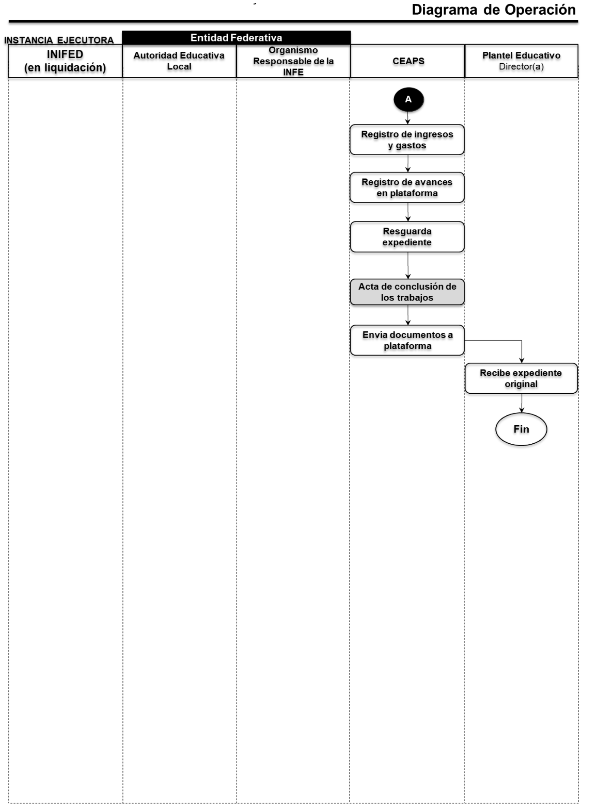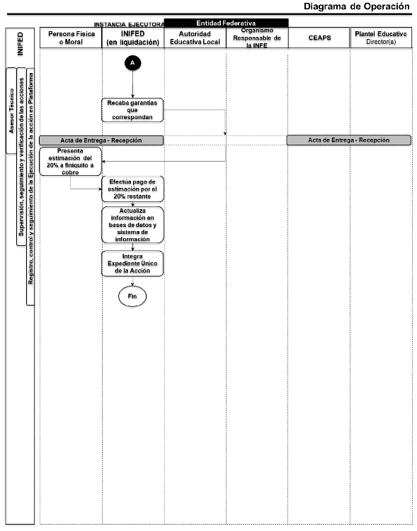 El proceso del sector educación está compuesto por 6 etapas: 1. Dictaminación, mediante la integración del listado inicial planteles con daños causados por los SISMOS no atendidos, acorde a los criterios de elegibilidad; 2. Aprobación, se verifican mediante inspecciones físicas los daños causados por los SISMOS, se determina el monto a otorgar y se celebra el convenio de concertación; 3. Ejecución, se realizan los trabajos de reconstrucción mediante plan de trabajo por los Comités Escolares de Administración Participativa CEAP o contrato a través del INIFED; 4. Seguimiento a las reconstrucción a través de bitácoras y la 5. Supervisión se contrata o designa al supervisor de trabajos, conforme a la normatividad aplicable; finalmente se procede al 6. Cierre, mediante un acta de conclusión de los trabajos realizados.