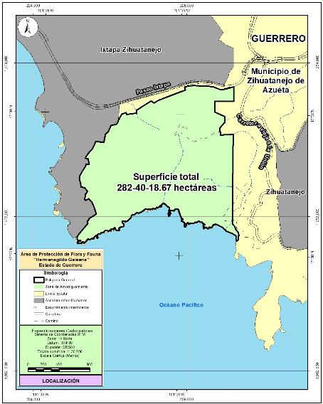 ARTÍCULO PRIMERO. Se declara área natural protegida Hermenegildo Galeana, con el carácter de área de protección de flora y fauna, la superficie de 282-40-18.67 hectáreas (doscientas ochenta y dos hectáreas, cuarenta áreas, dieciocho punto sesenta y siete centiáreas), que de acuerdo con el Marco Geoestadístico, versión 2022 del Instituto Nacional de Estadística y Geografía, se ubica en el municipio de Zihuatanejo de Azueta en el estado de Guerrero, conformada por un polígono general que corresponde a la zona de amortiguamiento.