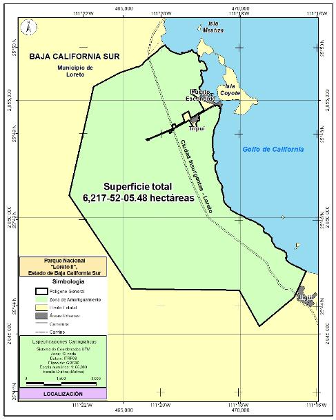ARTÍCULO PRIMERO. Se declara área natural protegida Loreto II, con el carácter de parque nacional, la superficie de 6,217-52-05.48 hectáreas (seis mil doscientas diecisiete hectáreas, cincuenta y dos áreas, cinco punto cuarenta y ocho centiáreas), que de acuerdo con el Marco Geoestadístico, versión 2022 del Instituto Nacional de Estadística y Geografía, se ubica en el municipio de Loreto, estado de Baja California Sur, conformada por un polígono general que corresponde a la zona de amortiguamiento.