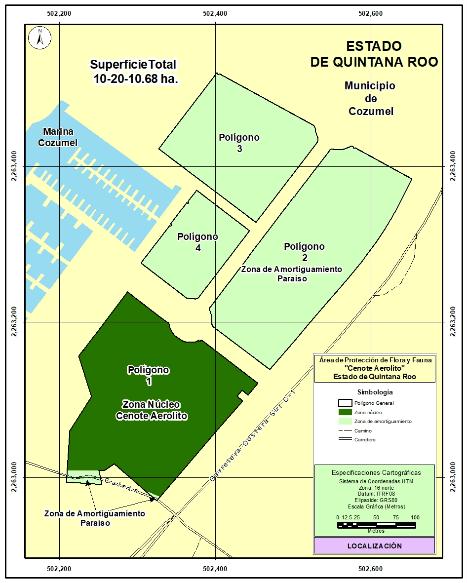 ARTÍCULO PRIMERO. Se declara área natural protegida Cenote Aerolito, con el carácter de área de protección de flora y fauna, la superficie de 10-20-10.68 hectáreas (diez hectáreas, veinte áreas, diez punto sesenta y ocho centiáreas), que de acuerdo con el Marco Geoestadístico, versión 2022 del Instituto Nacional de Estadística y Geografía, se ubica en el municipio de Cozumel, estado de Quintana Roo, conformada por cuatro polígonos generales, que se integran por la zona núcleo Cenote Aerolito con superficie de 3-61-80.65 hectáreas (tres hectáreas, sesenta y un áreas, ochenta punto sesenta y cinco centiáreas) y la zona de amortiguamiento Paraíso con superficie de 6-58-30.03 (seis hectáreas, cincuenta y ocho áreas, treinta punto cero tres centiáreas).