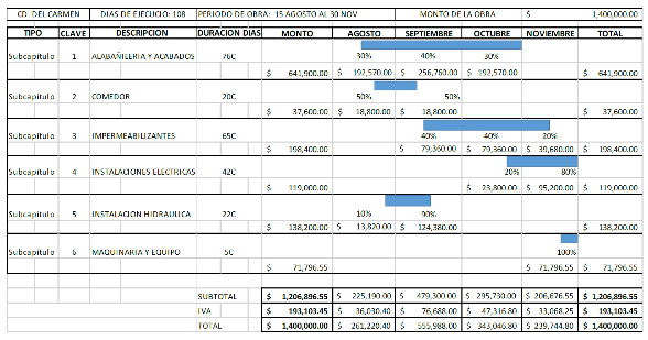 L) Cronograma de avance físico-financiero del proyecto, exclusivamente de la aportación que otorgue la CONAVIM, en el que se señale mes a mes, la duración de la obra y los conceptos de obra que se hayan programado con el subsidio otorgado: