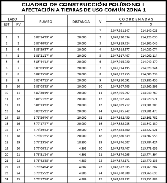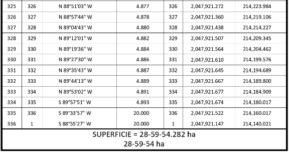 15. Que la Dirección General de Ordenamiento de la Propiedad Rural (DGOPR) de la Sedatu, el 10 de noviembre de 2022, emitió acuerdo de instauración del procedimiento de expropiación con número de expediente DGOPR-DE/SOE04CC/0045FONATUR TREN MAYA, S.A. de C.V/2022; 16. Que el comisionado técnico del RAN y el comisionado agrario de la Sedatu rindieron el "informe de comisión de Trabajos Técnicos e Informativos de Expropiación", de 23 de diciembre de 2022, en el que señalan que la superficie real a expropiar al ejido "Kilómetro 120", municipio de Calakmul, estado de Campeche es de 28-59-54 hectáreas, de terrenos de agostadero, de uso común, la cual se describe en el siguiente plano y cuadro de construcción: