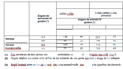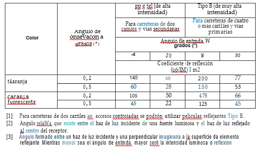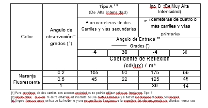 | | 21 | Comentario No: 6 Cláusula/Subcláusula: 6 Especificaciones y características del señalamiento vertical para protección en zonas de obras viales Párrafo/Figura/Tabla: Tabla 4 Tipo de Comentario: Modificación / Técnico Dice en el proyecto: ![]() Debe de decir: El ángulo de observación sólo tiene considerado para 0.2 y 0.5 grados, por lo que se deberá de incluir el ángulo de observación de 1", quedando la tabla de la siguiente manera: ![]() Justificación: Dado que las películas retro reflectantes "Tipo B Muy alta intensidad" por su homologación con la ASTM D4956 cuentan con la clasificación de películas retro reflectantes tipo XI, se deberán de agregar los coeficientes de retro reflectividad para el ángulo de observación de 1 " | Procede Se considera pertinente el agregar el ángulo de observación de 1° a la tabla 4 del proyecto de NOM, para películas tipo B de muy alta intensidad. | (Se agregan a la tabla 4 los coeficientes de reflexión correspondientes al ángulo de observación de 1°.) |