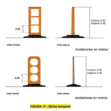 | | | o Cambiar el nombre de la FIGURA 4.- Barrera fija, para que diga FIGURA 4a.- Barrera fija con postes verticales ![]() FIGURA 4a.- Barrera fija con postes verticales l Agregar la Barrera fija con postes en forma de "A": 7.3.1.2 Barrera fija con postes en forma de "A" Generalmente son dos (2) tableros horizontales de plástico de diecisiete (17) centímetros de ancho y dos coma cero dos (2,02) metros de longitud, separados entre sí treinta y cinco (35) centímetros y sujetados ambos a dos (2) postes de plástico en forma de "A", como se muestra en la figura 4b. La parte inferior del tablero más bajo debe de estar a veintiún (21) centímetros del arroyo vial. l Agregar la figura 4b.- Barrera fija con postes en forma de "A" ![]() FIGURA 4b.- Barrera fija con postes en forma de "A" Modificar el inciso 7.3.3. para que diga: 7.3.3. Contenido Los tableros contarán con franjas de diez (10) centímetros de ancho, separadas entre sí diez (10) centímetros como se muestra en las figuras 4a. y 4b. de esta Norma. Dichas franjas estarán inclinadas a cuarenta y cinco (45) grados respecto a una Línea vertical, descendiendo hacia la izquierda. Estas figuras son esquemáticas y se presentan solo como ejemplo, de manera ilustrativa mas no limitativa | | |