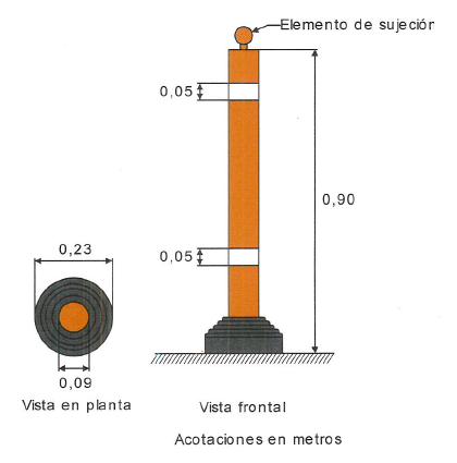 | | 45 | 7.- En el punto 7.14. Especificaciones y características de las balizas delineadoras En el inciso 7.14.1. Forma y tamaño Dice: Las balizas delineadoras son postes cilíndricos de cuando menos noventa (90) centímetros de altura y una base de apoyo de dimensiones tales que asegure su estabilidad, no menor a treinta (30) centímetros de diámetro, y un elemento en su parte superior que permita la sujeción de una malla o de una cinta de acordonamiento como se muestra en la figura 18 de esta Norma. Esta figura es esquemática y se presenta sólo como ejemplo, de manera ilustrativa mas no limitativa. Están hechos de un material semirrígido resistente a la intemperie y al impacto, de tal manera que no se deterioren ni causen daños a los peatones. Comentarios: Existen en el mercado, balizas delineadoras con base de menor diámetro que es muy pesada y proporciona la suficiente estabilidad de la baliza delineadora, por tal motivo proponemos reducir el diámetro de la base a veintitrés (23) centímetros mínimos. Proponemos: En el punto 7.14. Especificaciones y características de las balizas delineadoras Modificar el inciso 7.14.1. Forma y tamaño para que diga: Las balizas delineadoras son postes cilíndricos de cuando menos noventa (90) centímetros de altura y una base de apoyo de dimensiones tales que asegure su estabilidad, no menor a veintitrés (23) centímetros de diámetro, y un elemento en su parte superior que permita la sujeción de una malla o de una cinta de acordonamiento como se muestra en la figura 18 de esta Norma. Esta figura es esquemática y se presenta salo como ejemplo, de manera ilustrativa mas no limitativa. Están hechos de un material semirrígido resistente a la intemperie y al impacto, de tal manera que no æ deterioren ni causen daños a los peatones. Modificar la figura 18 baliza delineadora para que presente las siguientes medidas: ![]() | No procede El mercado ofrece múltiples variantes que deberán ser valoradas por el ingeniero proyectista a fin de que sean consideradas en el proyecto específico. La figura 18 es esquemática y se presenta sólo como ejemplo, de manera ilustrativa mas no limitativa. | |