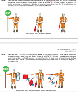 | Ing. Ricardo Alarcón Abarca, Director General, Centro SCT Guerrero, 14 de octubre de 2022 | 6 | En el párrafo "7.10. Especificaciones y utilización de las señales manuales", donde se establecen los lineamientos normativos en cuanto a los bandereros y a el equipamiento que deben emplear en sus actividades, se muestran imágenes inconsistentes en cuanto al contenido que se observa en el "Manual de Señalización Vial y Dispositivos de Seguridad". Toda vez que la Norma es de aplicación obligatoria, es claro que el "Capítulo VI. Señalamiento y dispositivos para protección en zonas de obras viales", del manual citado tendrá que ser revisado, modificado y corregido de manera que haya concordancia y compatibilidad con la NOM-086-SCT2-2022. | No procede Respecto del Manual de Señalización Vial y Dispositivos de Seguridad de la SCT del año 2014, al que se refiere el promovente, se tiene previsto sustituirlo por uno nuevo. En su caso, la modificación de dicho manual no es materia de la presente regulación. El comentario no incluye propuesta alguna sobre modificación al proyecto de NOM. | |