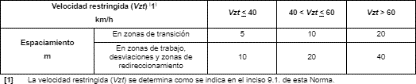 | | 9 | 7.8.2. Ubicación DICE: PROY-NOM-086-SCT2-2022 (Versión 5-sep-22): Los tambos se colocarán en serie sobre superficies uniformes en zonas de obras viales para las siguientes dos condiciones: 1) para obras viales con duración menor a veinticuatro (24) horas y velocidad restringida en la zona de trabajo entre cincuenta (50) y ochenta (80) kilómetros por hora, y 2) para obras viales con duración mayor a veinticuatro (24) horas y velocidad restringida en la zona de trabajo igual a ochenta (80) kilómetros por hora o menor; el espaciamiento longitudinal entre ellos es como se indica en la tabla 6. ![]() TABLA 6.- Espaciamiento longitudinal de los tambos DEBE DECIR: Propuesta de SEMOVI CDMX: Los valores de Velocidad restringida no coinciden con los rangos mostrados en la TABLA 6 ya que no se proporciona un límite superior de Vzt de 80 Km/hr en la tabla y el límite inferior de 50 Km/hr no se define en la tabla JUSTIFICACIÓN Definir los rangos de Vzt definidos en la TABLA 6 que correspondan con la redacción del párrafo descriptivo de su ubicación. | Procede Se considera pertinente el comentario del promovente. | (Se modifica la tabla 6 con nuevos valores de velocidad restringida) |