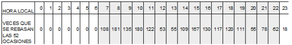 | Veces que rebasan en 25 ocasiones | 2 | 2 | 0 | 0 | 0 | 0 | 150 | 74 | 121 | 273 | 190 | 13 | 25 | 131 | 50 | 55 | 65 | 52 | 161 | 63 | 23 | 82 | 16 | 16 |