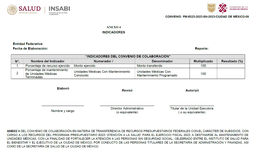 ANEXO 9 CONVENIO DE COLABORACIÓN EN MATERIA DE TRANSFERENCIA DE RECURSOS PRESUPUESTARIOS FEDERALES CON EL CARÁCTER DE SUBSIDIOS, CON CARGO A LOS RECURSOS DEL PROGRAMA PRESUPUESTARIO E023 "ATENCIÓN A LA SALUD" PARA EL EJERCICIO FISCAL 2023, A DESTINARSE AL MANTENIMIENTO DE UNIDADES MÉDICAS, CON LA FINALIDAD DE FORTALECER LA ATENCIÓN A LAS PERSONAS SIN SEGURIDAD SOCIAL, CELEBRADO ENTRE EL INSTITUTO DE SALUD PARA EL BIENESTAR Y EL EJECUTIVO DE LA CIUDAD DE MÉXICO, POR CONDUCTO DE LAS PERSONAS TITULARES DE LA SECRETARÍA DE ADMINISTRACIÓN Y FINANZAS, ASÍ COMO DE LA SECRETARÍA DE SALUD DE LA CIUDAD DE MÉXICO.
