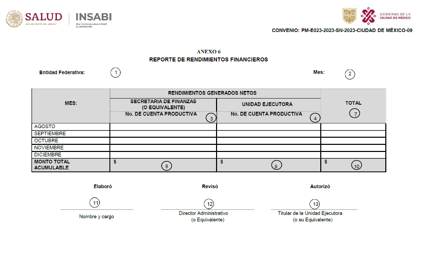 Nota: La Unidad Ejecutora deberá de presentar de manera mensual el registro y control del Formato "Reporte de Rendimientos Financieros" ante el INSABI, acompañado de los estados de cuenta bancarios de la Secretaría de Finanzas (o su equivalente) y de la Unidad Ejecutora.