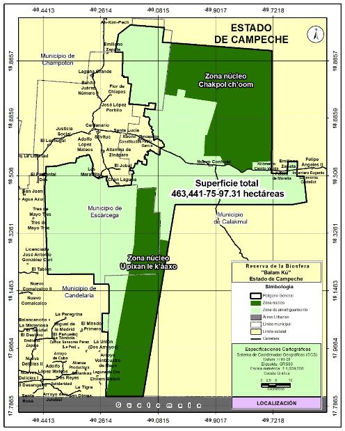 | Este segmento los vértices 2 y 3 se ajustan con el límite de la Reserva de la Biosfera Calakmul. | |||||