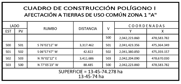 19. Que el comisionado técnico del RAN y el comisionado agrario de la Sedatu rindieron el "informe de comisión de Trabajos Técnicos e Informativos de Expropiación", de 3 de abril de 2023, en el que señalan que la superficie real a expropiar al ejido "Allende", municipio de Othón P. Blanco, estado de Quintana Roo, es de 14-23-20 hectáreas de terrenos de temporal de uso común, lo cual se describe en el siguiente plano y cuadros de construcción: