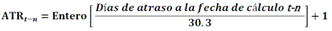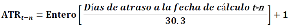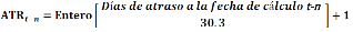 | Máximo número de atrasos presentado en los últimos 7 meses considerando el mes de calificación Calculado a la fecha de calificación (cierre de mes) | ![]() Donde: ATRt-n: Número de atrasos observados a la fecha de calificación (cierre de mes), donde "t-0" corresponde a la fecha de calificación (cierre de mes), y "t-n" corresponde a "n" periodos mensuales anteriores a la fecha de calificación (cierre de mes), que los Organismos de Fomento y Entidades de Fomento calcularán de acuerdo a lo siguiente: ![]() Cuando días de atraso a la fecha de calificación (cierre de mes) t-n sea igual a 0, ATRt-n tomará el valor de 0. El cálculo deberá realizarse considerando todas las exposiciones del acreditado con la Institución. Días de Atraso: Número de días naturales a la fecha de calificación (cierre de mes), durante los cuales el acreditado no haya liquidado en su totalidad el monto exigible en los términos pactados originalmente. Esta variable deberá ser expresada como un número mayor o igual a cero. Monto exigible: Monto que corresponde cubrir al acreditado en el periodo pactado. El Monto Exigible deberá considerar tanto el importe correspondiente al periodo pactado, como los importes exigibles de periodos anteriores no pagados, si los hubiera. En caso de que el acreditado no cuente con el tiempo de experiencia interna necesario para el cálculo de la variable, se realizará el cálculo con la información disponible al momento de la calificación. |
