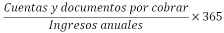 | Periodo de cobro a deudores Antigüedad no mayor a 18 meses a la fecha de calificación (cierre de mes) | Plazo medio de cobro, en número de días, que una empresa tarda en realizar el cobro a sus clientes. ![]() Donde: · Cuentas y documentos por cobrar, será el monto reportado en el estado de situación financiera del acreditado. · Ingresos anuales, será el acumulado de los ingresos reportados en el estado de resultado integral del acreditado, considerando un horizonte temporal de los últimos 12 meses. En el caso de acreditados de nueva creación que no cuenten con 12 meses de información financiera o su equivalente a la fecha de calificación (cierre de mes), se deberá utilizar la totalidad de la información disponible a la fecha de calificación (cierre de mes) para realizar el cálculo. |