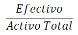 | Razón de efectivo a activo total Antigüedad no mayor a 18 meses a la fecha de calificación (cierre de mes) | Proporción que representa el efectivo sobre el activo total ![]() Donde: · Efectivo, será el monto reportado en el estado de situación financiera del acreditado. · - Activo Total, será el monto reportado en el estado de situación financiera del acreditado. |