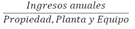 | Razón de uso de activos fijos Antigüedad no mayor a 18 meses a la fecha de calificación (cierre de mes) | Eficiencia en la utilización del activo fijo para generar ingresos: ![]() Donde: · Ingresos anuales, será el acumulado de los ingresos reportados en el estado de resultado integral del acreditado, considerando un horizonte temporal de los últimos 12 meses. En el caso de acreditados de nueva creación que no cuenten con 12 meses de información financiera o su equivalente a la fecha de calificación (cierre de mes), se deberá utilizar la totalidad de la información disponible a la fecha de calificación (cierre de mes) para realizar el cálculo. · Propiedad, Planta y Equipo, será el monto reportado en el estado de situación financiera del acreditado. |