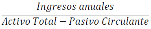| Razón de ventas a capital operativo empleado Antigüedad no mayor a 18 meses a la fecha de calificación (cierre de mes) | Uso del capital operativo empleado: ![]() Donde: · Ingresos anuales, será el acumulado de los ingresos reportados en el estado de resultado integral del acreditado, considerando un horizonte temporal de los últimos 12 meses. En el caso de acreditados de nueva creación que no cuenten con 12 meses de información financiera o su equivalente a la fecha de calificación (cierre de mes), se deberá utilizar la totalidad de la información disponible a la fecha de calificación (cierre de mes) para realizar el cálculo. · Activo Total, será el monto reportado en el estado de situación financiera del acreditado. · Pasivo Circulante, será el monto reportado en el estado de situación financiera del acreditado. |