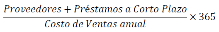 | Periodo de pago de acreedores Antigüedad no mayor a 18 meses a la fecha de calificación (cierre de mes) | Plazo medio de pago, en número de días, que la empresa tarda en pagar préstamos y proveedores. ![]() Donde: · Proveedores, será el monto reportado en el estado de situación financiera del acreditado. · Préstamos a Corto Plazo, será el monto reportado en el estado de situación financiera del acreditado. · Costo de Ventas anual, será el acumulado de los costos de ventas reportados en el estado de resultado integral del acreditado, considerando un horizonte temporal de los últimos 12 meses. En el caso de acreditados de nueva creación que no cuenten con 12 meses de información financiera o su equivalente a la fecha de calificación (cierre de mes), se deberá utilizar la totalidad de la información disponible a la fecha de calificación (cierre de mes) para realizar el cálculo. |