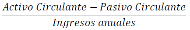 | Razón de capital de trabajo a ventas Antigüedad no mayor a 18 meses a la fecha de calificación (cierre de mes) | Proporción que representan los activos circulantes menos los pasivos circulantes respecto a las Ventas Netas totales. ![]() Donde: · Activo Circulante, será el monto reportado en el estado de situación financiera del acreditado. · Pasivo Circulante, será el monto reportado en el estado de situación financiera del acreditado. · Ingresos anuales, será el acumulado de los ingresos reportados en el estado de resultado integral del acreditado, considerando un horizonte temporal de los últimos 12 meses. En el caso de acreditados de nueva creación que no cuenten con 12 meses de información financiera o su equivalente a la fecha de calificación (cierre de mes), se deberá utilizar la totalidad de la información disponible a la fecha de calificación (cierre de mes) para realizar el cálculo. |