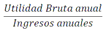 | Margen bruto de utilidad Antigüedad no mayor a 18 meses a la fecha de calificación (cierre de mes) | Proporción de los ingresos libres después de cubrir el costo de ventas. ![]() Donde: · Utilidad Bruta anual, será el acumulado de las utilidades brutas reportadas en el estado de resultado integral del acreditado, considerando un horizonte temporal de los últimos 12 meses. En el caso de acreditados de nueva creación que no cuenten con 12 meses de información financiera o su equivalente a la fecha de calificación (cierre de mes), se deberá utilizar la totalidad de la información disponible a la fecha de calificación (cierre de mes) para realizar el cálculo · Ingresos anuales, será el acumulado de los ingresos reportados en el estado de resultado integral del acreditado, considerando un horizonte temporal de los últimos 12 meses. En el caso de acreditados de nueva creación que no cuenten con 12 meses de información financiera o su equivalente a la fecha de calificación (cierre de mes), se deberá utilizar la totalidad de la información disponible a la fecha de calificación (cierre de mes) para realizar el cálculo. |